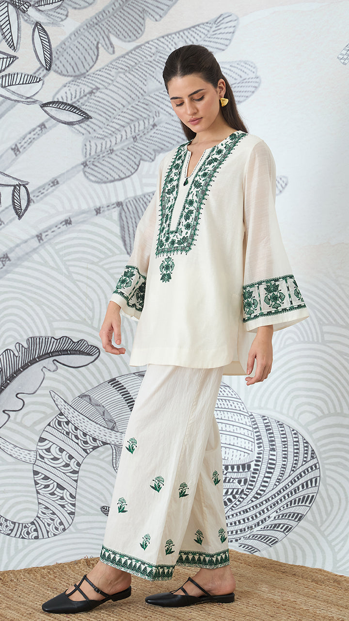 GREEN YOKE EMBROIDERY SHORT TUNIC WITH PANTS