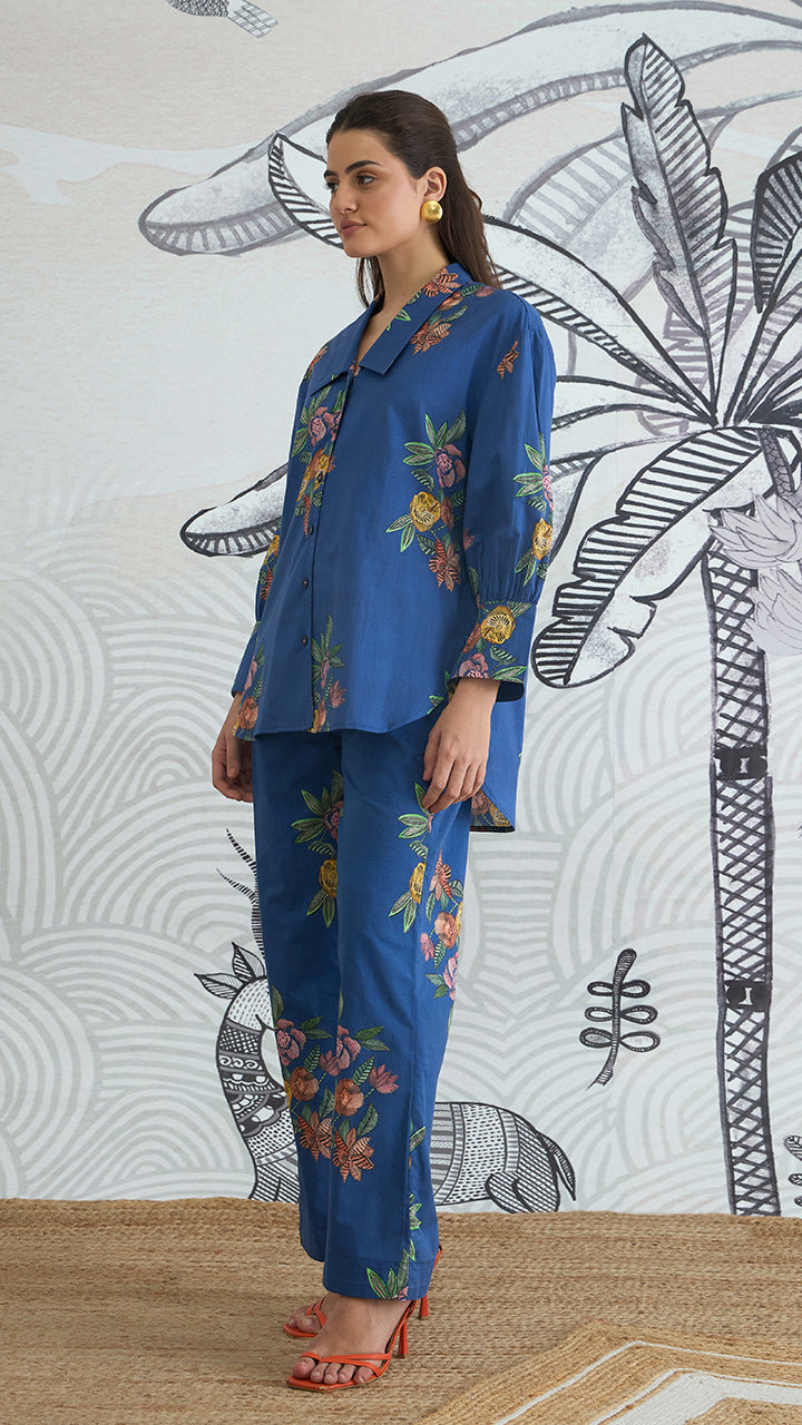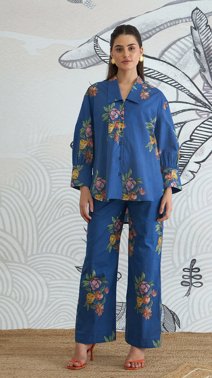 BLUE FLOWER BIG COLLAR SHIRT WITH BLUE FLOWER PANTS
