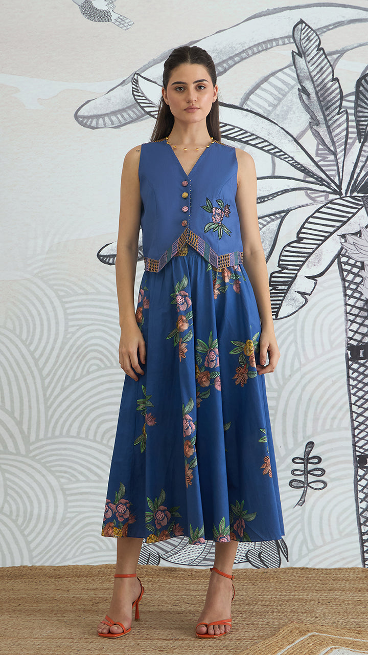 BLUE EMB WAISTCOAT TOP AND BLUE FLOWER SKIRT