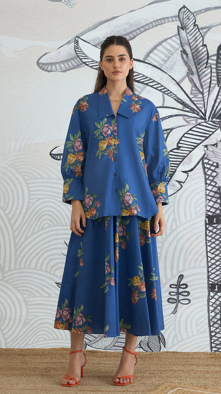 BLUE FLOWER BIG COLLAR SHIRT WITH BLUE FLOWER SKIRT