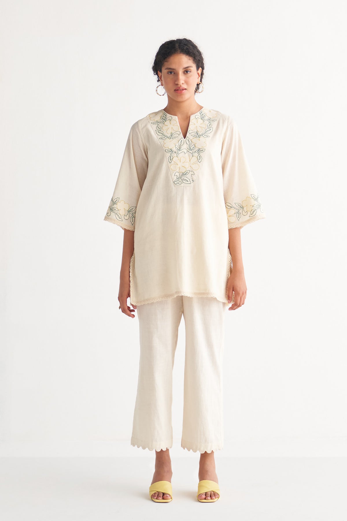 This Co-Ord set is crafted from high-quality Handloom Cotton fabric, ensuring comfort and durability. The tunic has a unique overlapped V neckline, bell sleeves enhanced with floral cross-stitch pop embroidery. Completing the overall look is the addition of pockets and cotton lace on both tunic and pants, which enhances the tunic's feminine charm.