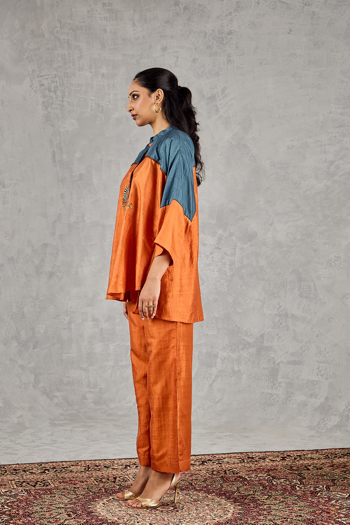 Blue and burnt orange colourblock silk set, features a beautifully embroidered front with delicate bead and thread work for a stylish balance of tradition and modernity. (TUNIC LENGTH- [FRONT- 29, BACK-31]) Fabric: Silk Fit: Comfort Fit Color: BURNT ORANGE/ PURPLE No. Of Components: 1