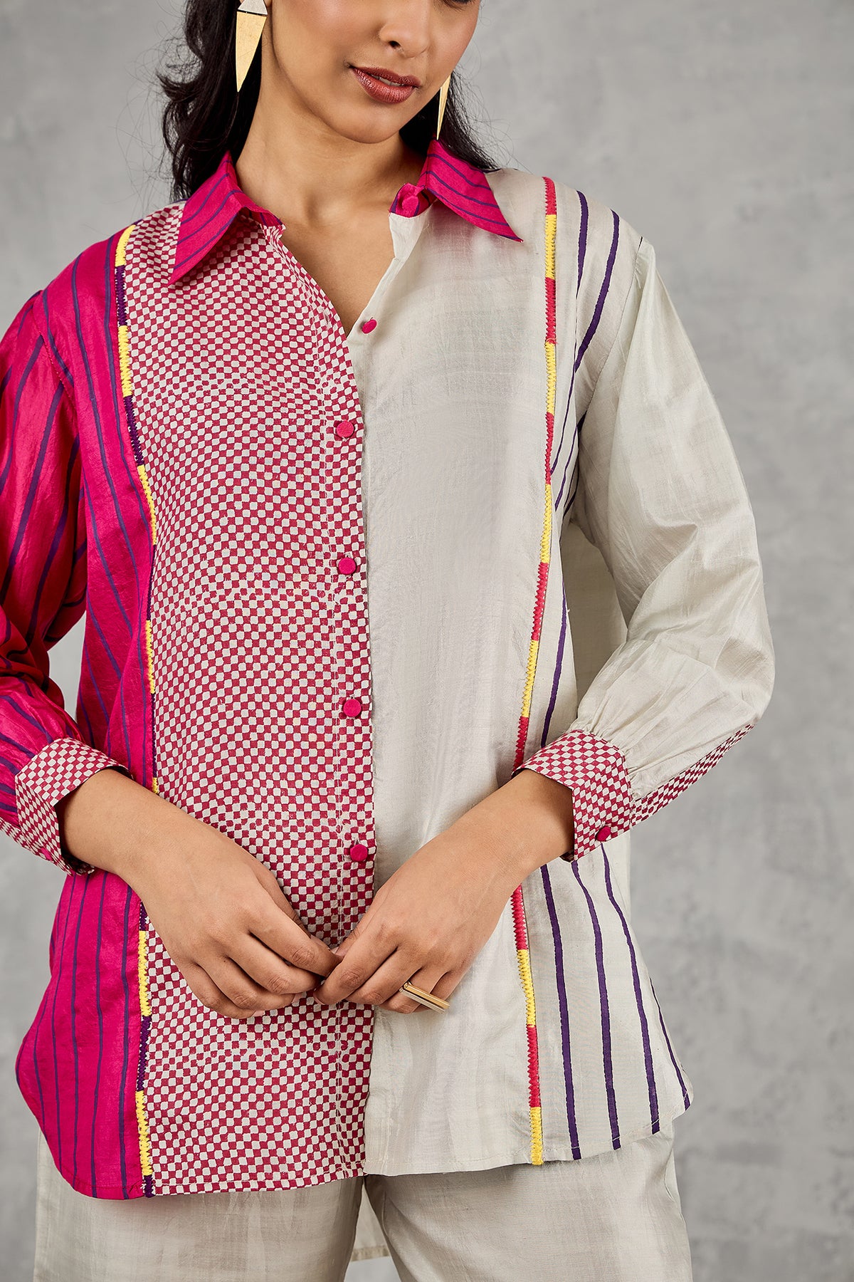 This silk ensemble features a relaxed, full-sleeved shirt in a striking combination of grey and hot pink, and patterned textures. The shirt showcases a playful contrast of panels from classic checks to bold solid hues, finished with vibrant pink buttons and delicate hand block printed stripes.(SHIRT LENGTH- [FRONT- 28, BACK-30], SLEEVE LENGTH- 20) Fabric: Silk Fit: Comfort Fit Color: Grey No. Of Components: 1