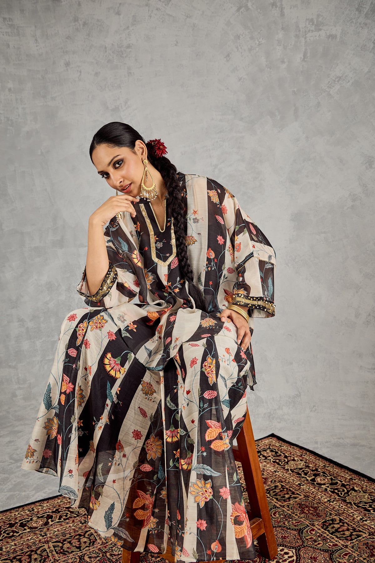 This chanderi set features a black and white striped base adorned with a chintz floral print. The free-size tunic is designed for relaxed elegance, flowing beautifully on the body with ease. It’s finished with intricate embroidery on the cuffs and delicate gota detailing at the neckline, adding a festive shimmer to the overall look. Paired with flared kali pants, this outfit ensures graceful movement and a flattering silhouette. (NAMAH TUNIC LENGTH- {FRONT- 29, BACK- 31}, PANT LENGTH- 40)