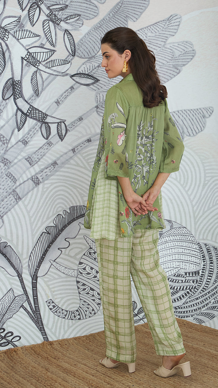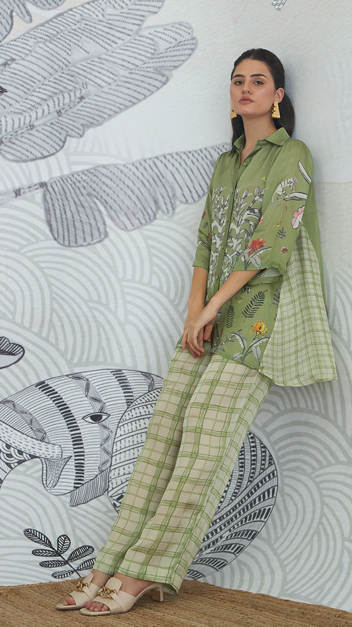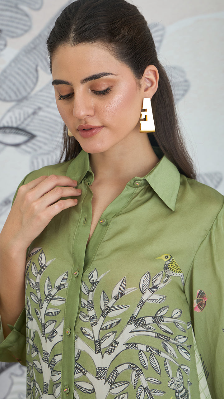 Channel the serene spirit of nature with our 'Mithila' olive green shirt. The luxurious silk satin shirt features intricate Madhubani jungle motifs, offering a modern take on traditional art. This comfortable and stylish ensemble is perfect for cultural explorations, leisurely holidays, or an effortlessly refined airport look.