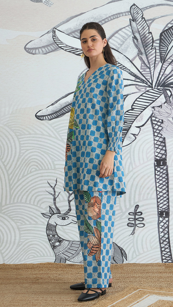 Brighten your wardrobe with our 'Mithila' Blue Check and Floral Cotton tunic. This vibrant and comfortable ensemble, featuring unique floral and check patterns, is expertly crafted from breathable cotton. An ideal Blue Check and Floral Cotton tunic for effortless summer style, travel, and warm-weather adventures.