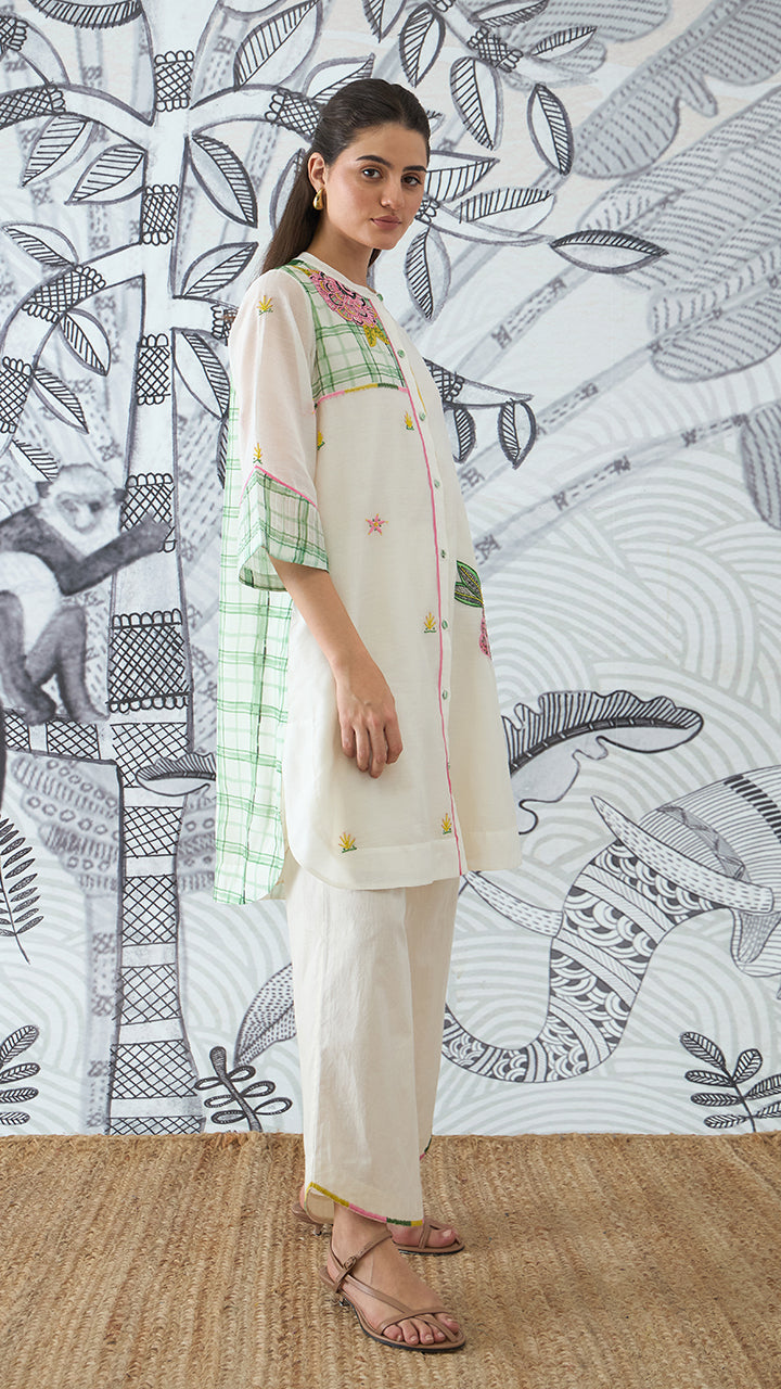 Experience exquisite craftsmanship with our 'Mithila' Cotton Silk Tunic. This comfortable and breathable piece features mesmerizing floral embroidery, delicate beadwork, and intricate appliqu work. Highlighted with check print on the back panel and cuffs, it's a true work of art for your summer collection.