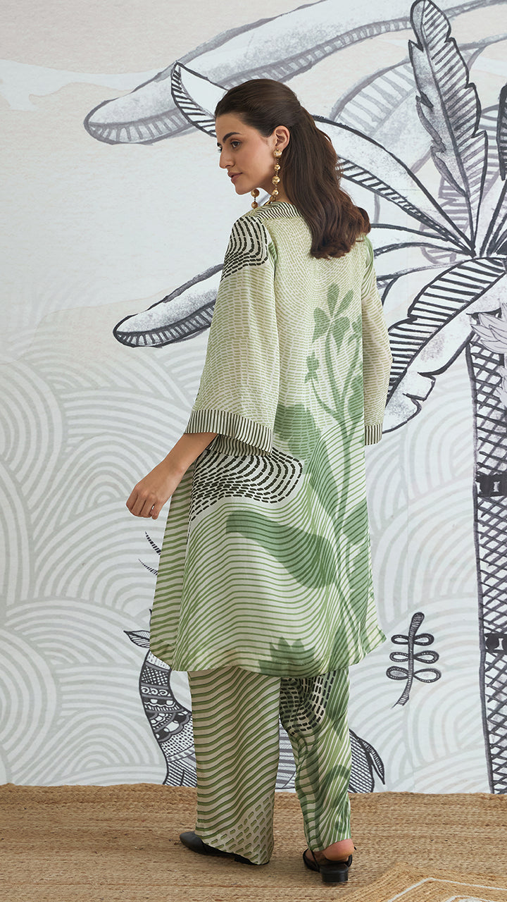 Step into modern artistry with our 'Mithila' luxurious Silk Satin Tunic. This comfortable and breathable ensemble features a contemporary Madhubani print, blending bold floral patterns with sleek lines. An ideal tunic for sophisticated summer outings and elegant travel.