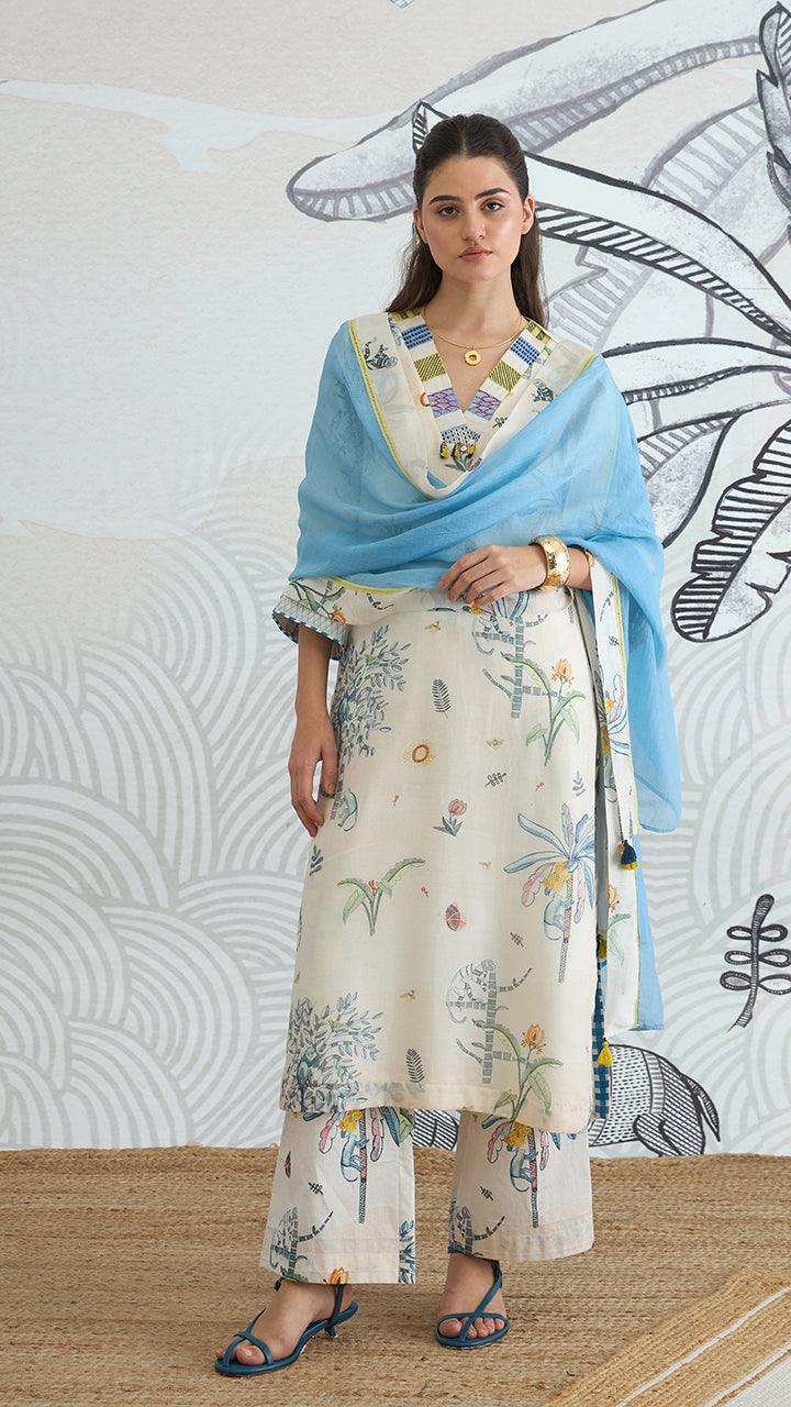 Step into cultural elegance with our 'Mithila' Jungle print Kurta . The comfortable cotton silk kurta . Completing the look is a soft chanderi blue dupatta with a delicate printed border. This breathable kurta is perfect for summer occasions or stylish holiday gatherings.