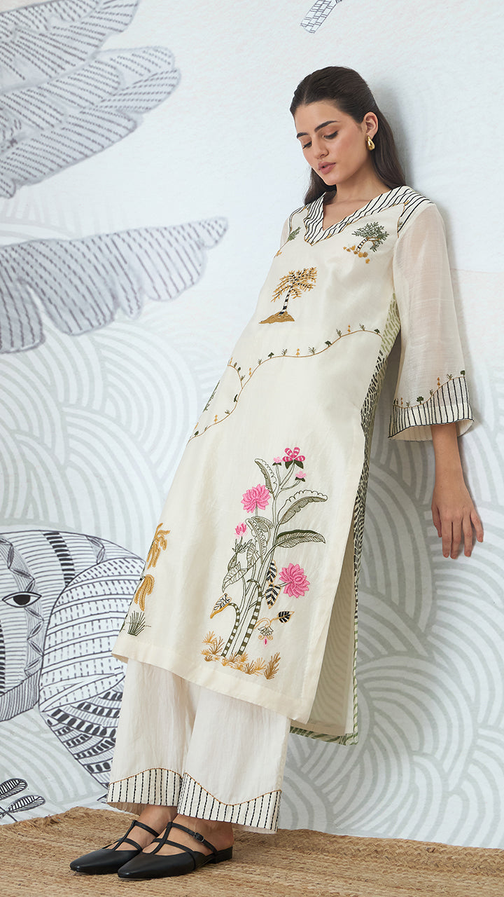 Adorn yourself in a piece of art with our 'Mithila' Kurta . This unique kurta style boasts all-over landscape embroidery, depicting bold cross-stitch flowers, trees, and mountain impressions, with a subtle texture print on the back panel. A comfortable and breathable ensemble that truly captures the spirit of summer storytelling.