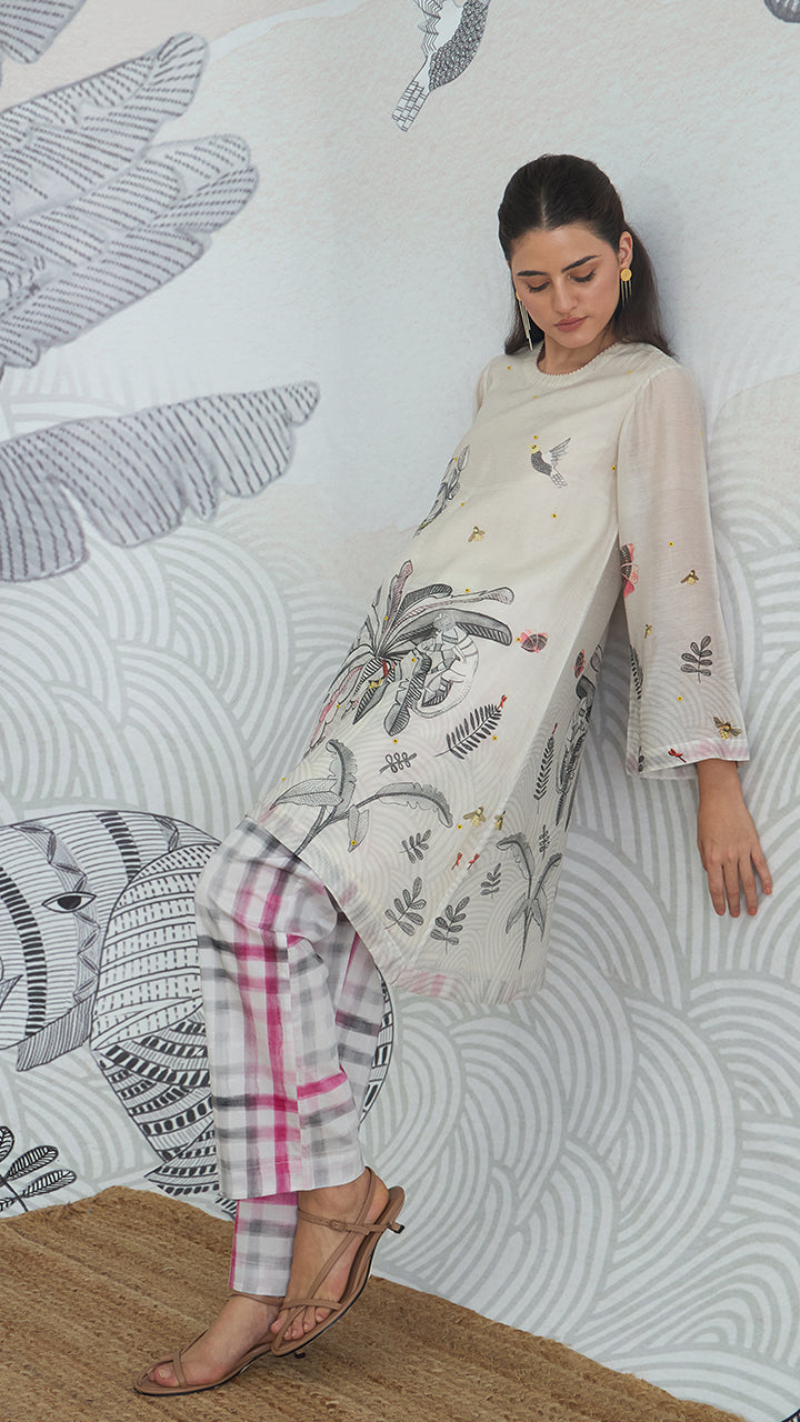 Embrace cultural charm with a contemporary edge in our 'Mithila' tunic and plaid pants set. The elegant greyish-white cotton silk tunic features subtle yet captivating Madhubani jungle motifs, offering a fresh take on traditional art. Paired with modern checked wide-leg pants in vibrant pink. This ensemble is perfect for adding a touch of playful sophistication to your travels, holidays, or stylish everyday wear.