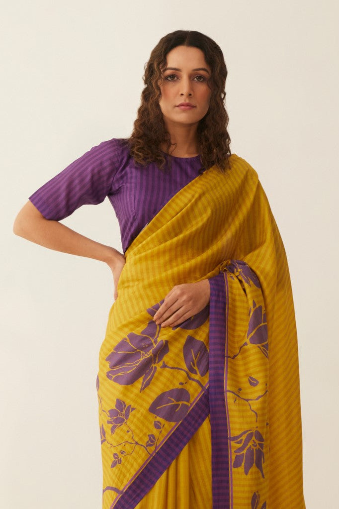 Mustard and Purple Magnolia Floral Silk Saree With Blouse