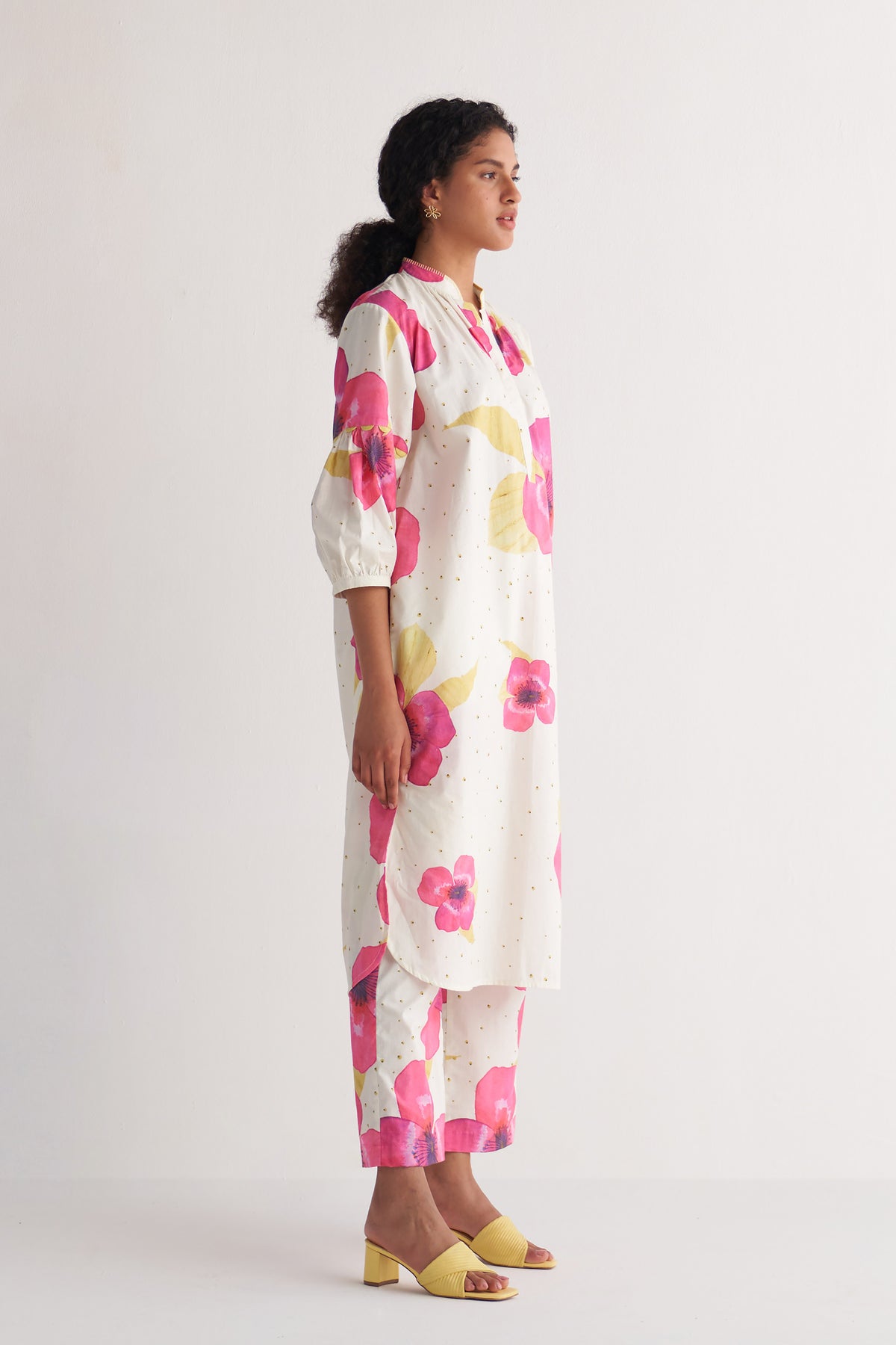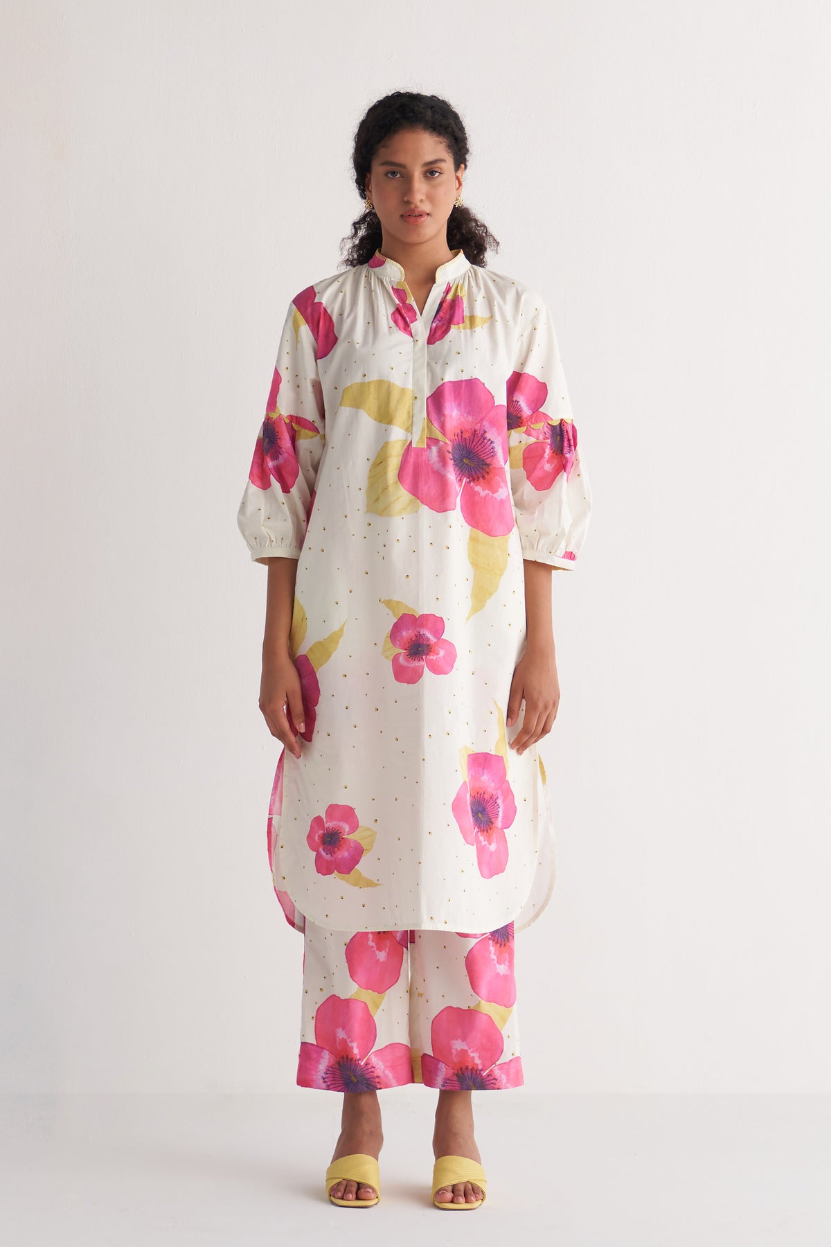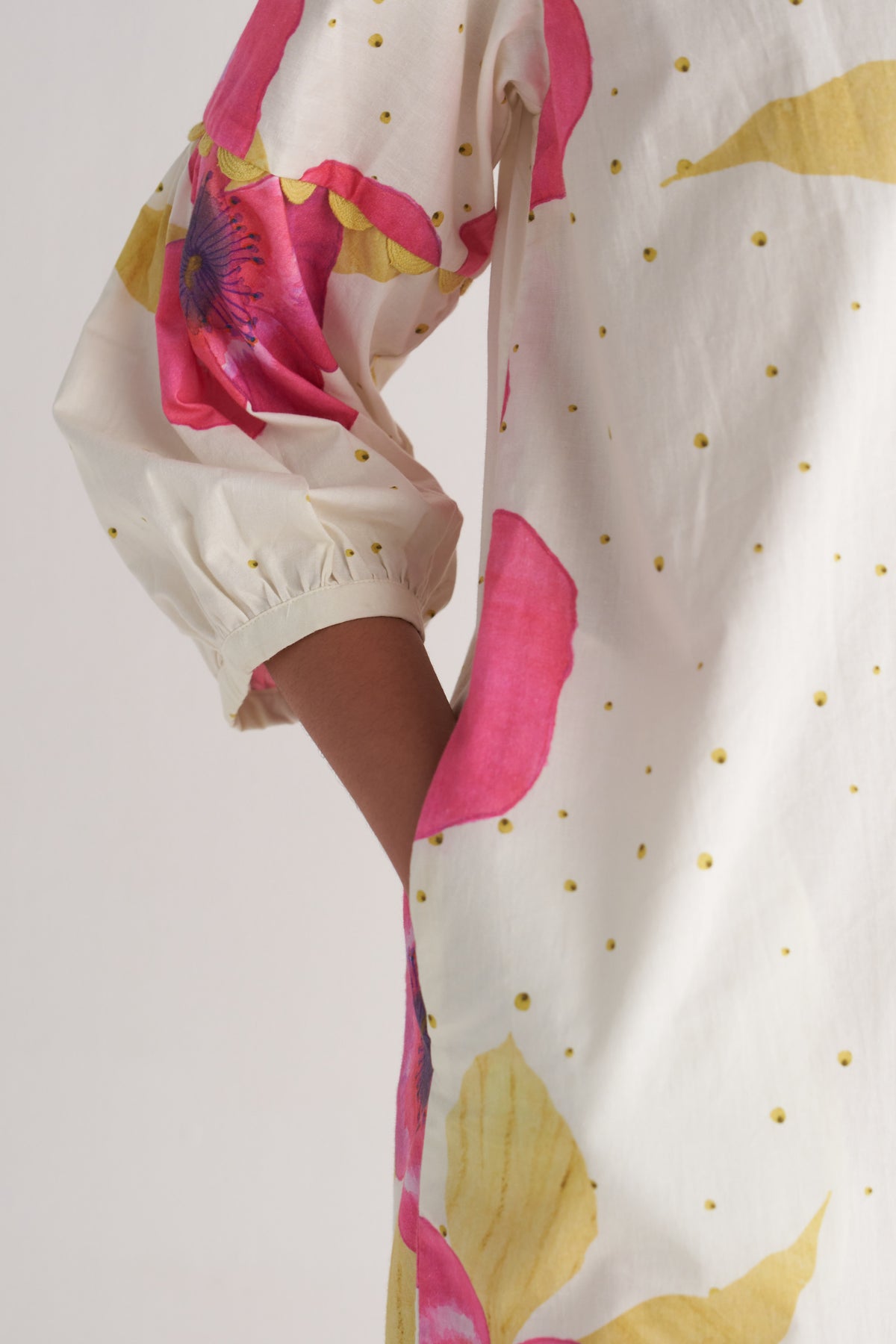 This shirt dress and pants set features a delightful combination of hand made pink and yellow flowers on a dotted off-white texture cotton cambric fabric. The high-low hemline style adds movement and a contemporary touch to the dress. To add to the functionality, the dress is equipped with pockets and comfortable sleeves. Same print floral pants ensure a coordinated and cohesive look.